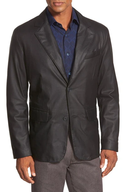 Smooth lambskin leather covers a handsome blazer with a sleek notched collar. The lightweight style features a smart ascot pocket and two front buttons. Style Name: Remy Leather 'Lite' Button Blazer. Style Number: 393920. Available in stores.