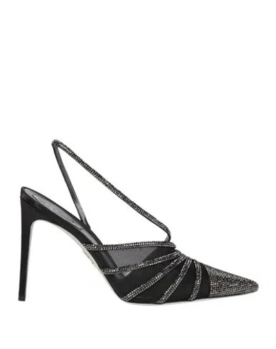 120mm leather pumps from René Caovilla featuring black, calf leather, crystal embellishment, slingback strap, pointed toe, branded insole and high heel.
