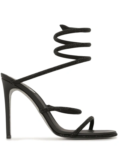 Defined by a spiral wraparound strap, this smooth leather sandal is adorned with tonal crystals. Lamb leather/satin upper Round open toe Wraparound strap Calf leather sole Made in Italy SIZE Leather-covered stiletto heel, 4" (105mm). Women's Shoes - Designer Womens Shoes > Rene Caovilla > Saks Fifth Avenue > Barneys. Rene Caovilla. Color: Black. Size: 11.