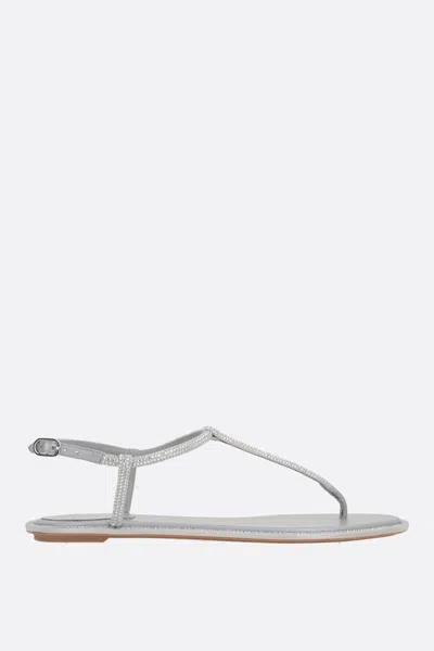 René Caovilla's thong sandals crafted in grey satin embellished by matching micro-rhinestones. Featuring a round-toe silhouette, adjustable ankle strap with metal buckle, leather lining and rubber sole.. Gender: Women. Material: 100% SATIN (68% VISCOSE 32% SILK WOVEN). Color: SILVER. Made in: IT. Product ID: C11574010R001V232. *Import tax/duty will be calculated at checkout (If applicable)