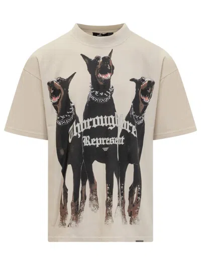 Represent T-shirt in beige cotton with front graphic of three Dobermans and gothic lettering.