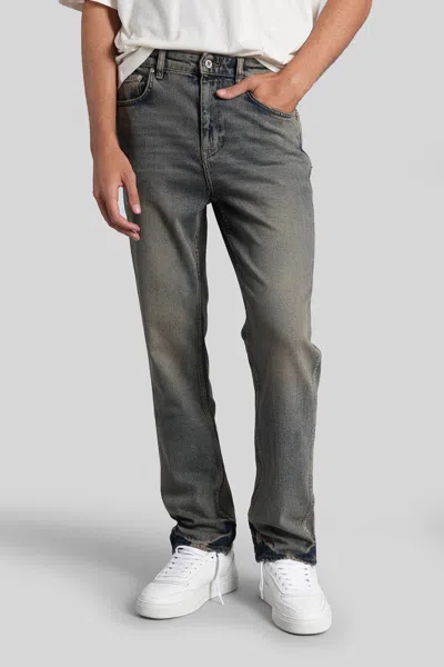 R1 slim denim Jeans in blue cotton, zip and button closure, belt loops, five pockets, back embroidered logo, metallic logo, 99% cotton, 1% elastan, Made in Turkey, the models is 1.91 and wears size 31