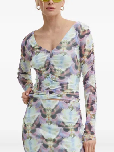 multicolour floral print scoop neck long sleeves ruched detail gathered seams