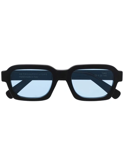 Black Caro rectangular sunglasses from RETROSUPERFUTURE featuring blue tinted lenses, square frame, gold-tone logo lettering and curved arms.