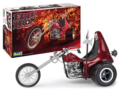 Brand new plastic model kit of Evil Iron Custom Chopper Trike (Level 5) 1/8 plastic model kit by Revell. Brand new box. Soft black tires. Colorful decal artwork. Vintage style packaging. Officially licensed product. Chrome plated small parts. Contains 153 detailed parts. Classic custom chopper trike styling. Paint and cement required (not included). Manufacturer's original unopened packaging. Parts molded in WHITE, unless otherwise indicated. Removable long-handled parade axe and optional iron mask. Dimensions approximately L-14.5, W-7.75, H-8 inches assembled. All-new decal sheet includes wild flame decals in two different colors. Includes soft vinyl tubing to represent spark plug leads and various control cables. Period-perfect details include stretched-out front forks and swept-back handle bars.