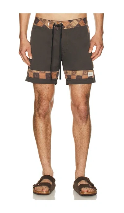 Rhythm Racket Trunk in Black. - size 30 (also in 32, 33, 34, 36) Rhythm Racket Trunk in Black. - size 30 (also in 32, 33, 34, 36) 65% cotton 35% nylon. Machine wash. Drawstring closure. 3-pocket styling. Lightweight ripstop swim fabric. Shorts measure approx 16 in length. RHYT-MX78. CD25M-TR05-BLK. Rhythm brings together a unique group of designers, artists, musicians, surfers and snowboarders with a shared dream of creating a livelihood doing what they love. Drawing on influences frim the worlds of art, and music Rhythm is for those who yearn for new frontiers over the well worn path.
