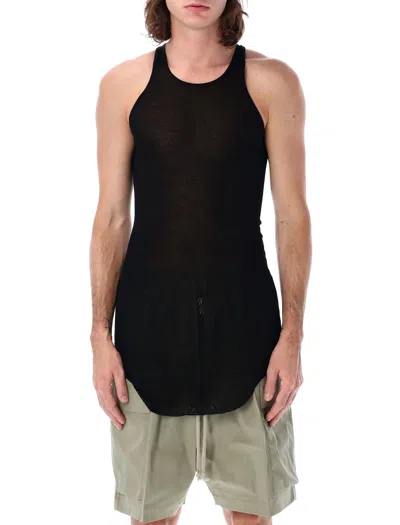 BASIC RIB TANK BY RICK OWENS. FEATURING: LIGHTWEIGHT VISCOSE AND SILK JERSEY ROUND NECK THIN SHOULDER STRAPS RACER BACK ROUND RAW CUT HEM SIGNATURE SINGLE SEAM AT CENTRE BACK HIP LENGHT MODEL IS 1,90 M AND WEARS SIZE L | Rick Owens Men's Basic Rib Tank Top in Black | Size Medium | 25PRU01E5150RC Color 09