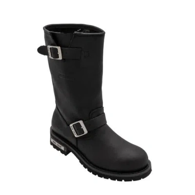 This 11 inch black heavy-duty full-grain leather upper engineer biker boot is tough enough to protect against any harsh work environment and classy enough to convey status. The split shaft and two adjustable straps with buckle closures allow for a tailored fit at the calf. There is also Goodyear welt construction that ensures durability. Heavy Duty Full-Grain Oiled Leather Goodyear Welt Construction Plain Soft Toe Oil Resistant Outsole Adjustable Vamp & Side Ankle Straps Comfort Cushion Insole