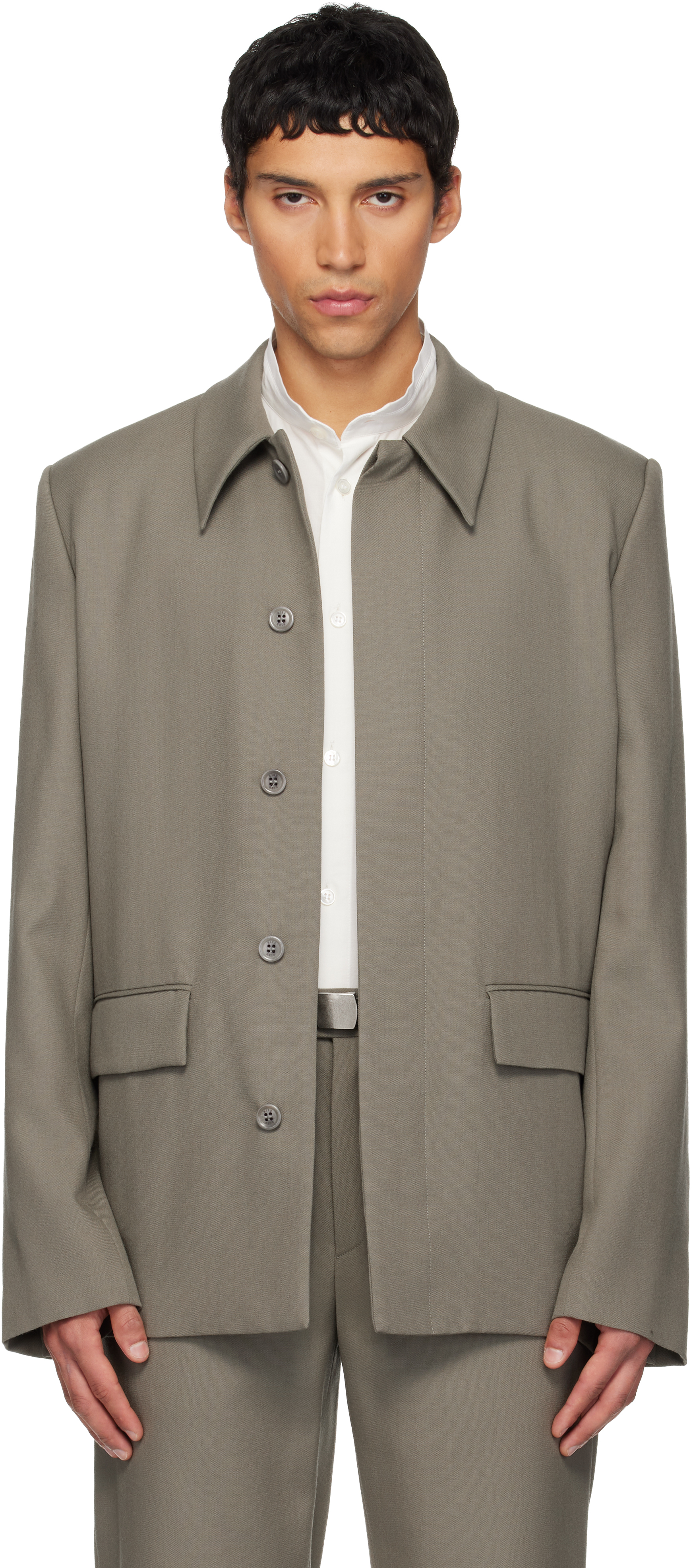 grey flap pockets notched lapels long sleeves button fastening