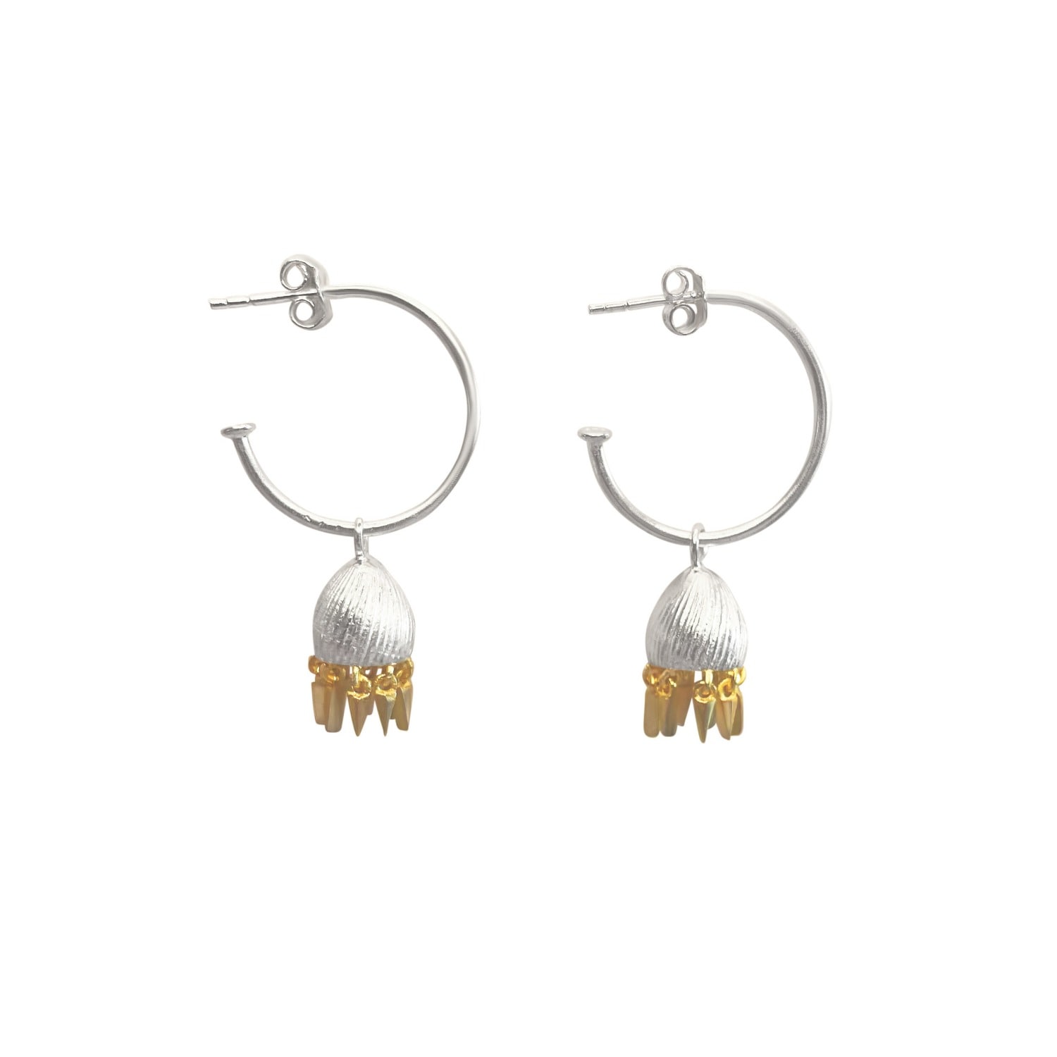 Silver and gold mixed metals feature in this western tribute to the Indian Jhumka earrings. An open ended hoop, a dome paying homage to beautiful shapes of ancient temples and tiny amulet arrows create a modern/heritage mix. Arrows symbolise divine will, direction, and the overcoming of obstacles. Sterling silver & 22k gold plated (1 micron), recycled sterling silver base (92. 5), hoop 20mm wide, inc dome & arrows 40mm, handmade by Fairtrade artisans, 10% of all sales go to our partnered children's charities. Do not apply perfumes or creams while wearing your jewelry and remember to remove it before you shower. Gently rub the surface of your jewelry using the soft cloth we provide to help restore shine. You can also soak your jewelry for a few minutes in warm, slightly soapy water and dry with a soft cloth. To avoid scratches, tangling and tarnishing, store in the bag we provide. Keep away from direct sunlight and heat.