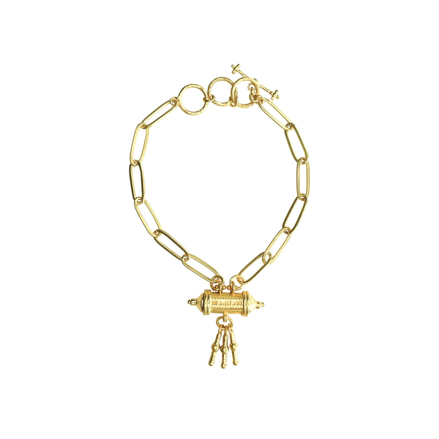 Kavacha translates from the ancient language Sanskrit as armour or shield. The charm on this bracelet is based on protective amulets worn in India for generations. Kavacha are also said to help remove obstacles and negative influences to create a clear path for positive outcomes and the fulfilment of wishes (manifestation). The word "Manifest" is etched on the side of the auspicious amulet. 22k Gold plated (1 micron), brushed finish. Brass base. Length 7. 5". Handmade by Fairtrade artisans. 10% of all sales go to our partnered children's charities Do not apply perfumes or creams while wearing your jewelry and remember to remove it before you shower. Gently rub the surface of your jewelry using the soft cloth we provide to help restore shine. You can also soak your jewelry for a few minutes in warm, slightly soapy water and dry with a soft cloth. To avoid scratches, tangling and tarnishing, store in the bag we provide. Keep away from direct sunlight and heat.