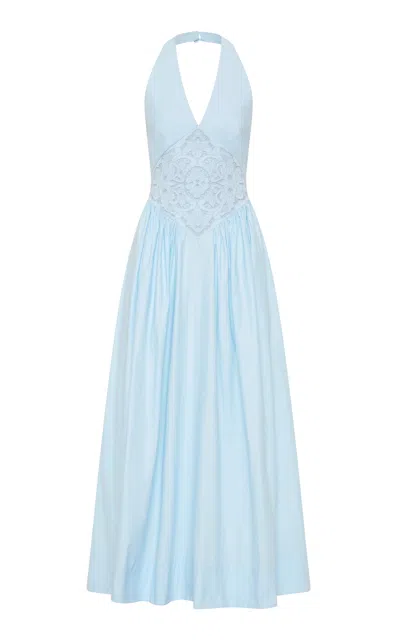 Halter neck dress with fitted waist and A-line gathered skirt; featuring in-house embroidery anglaise detailing.
