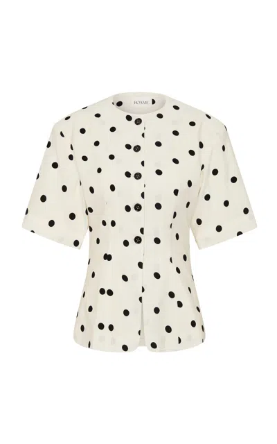 Button-front top in flocked spot fabrication. Structured through the shoulders with subtle shoulder pads.
