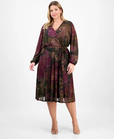 ROBBIE BEE Plus Size Long-sleeve Printed Mesh A-line Dress In Brown