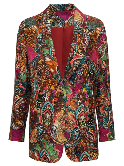 This tailored blazer is a walking piece of art. Notice the extraordinary colors in this animal and paisley mixed print. Designed in a relaxed fit with a soft molded shoulder, this piece is perfect for layering over a casual tee or a dressy blouse. * Notch lapel with button front * Single breasted * Front patch pockets * Relaxed fit * Lightly padded shoulder * Long sleeve * Four button cuff * Rear vents * 78% viscose, 22% silk * Dry clean only * Imported