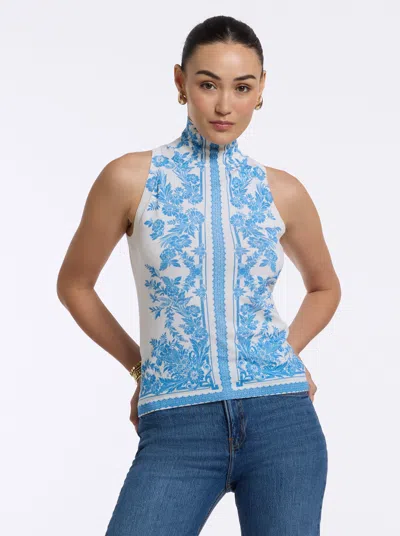 The Jacey sweater brings elegance to any look. The soft hues of this sleeveless turtleneck and the silky cotton fabric come together to create a truly luxe piece. Layer under the matching Penelope jacket and pair with the Raisa short for a chic ensemble. Turtleneck Floral print Sleeveless 1x1 Rib bottom hem 70% cotton, 30% silk Machine wash cold Imported