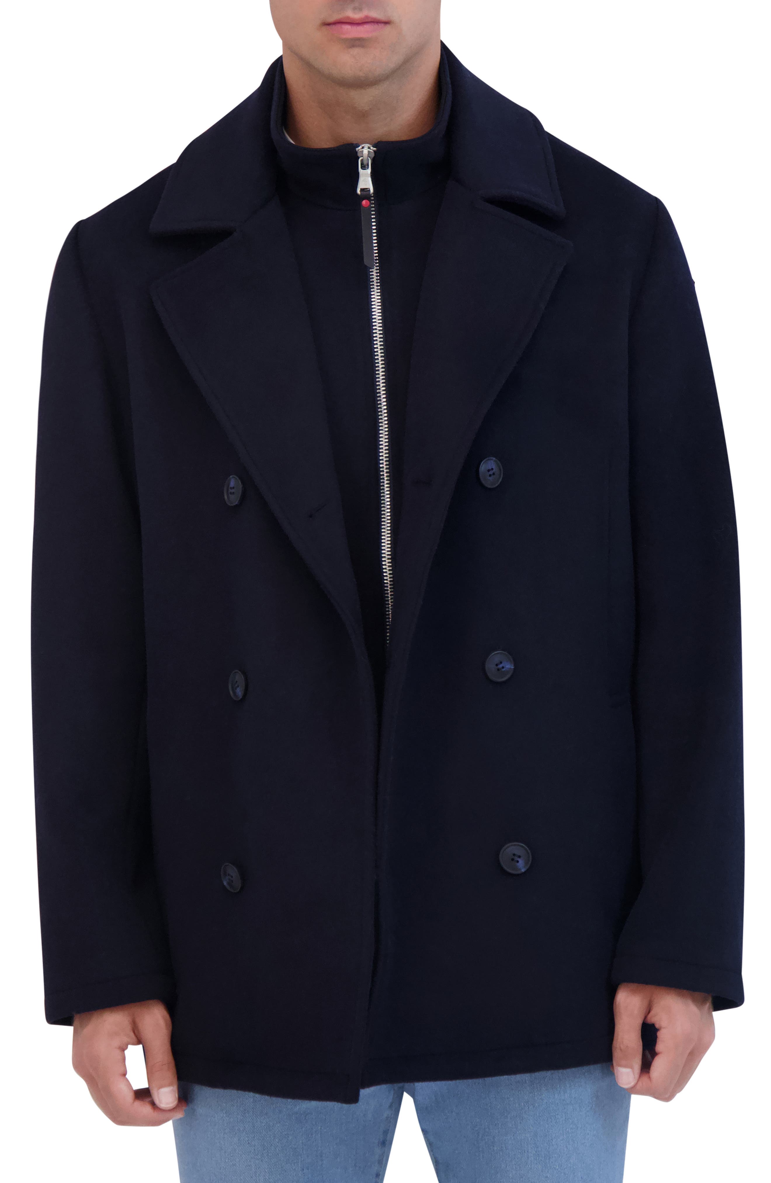 Adjust your look as the temperatures dip in this timeless peacoat jacket styled with a removable bib and multiple pockets. 32" length Double-breasted button closure Notched collar Front welt pockets Back vent Lined 60% other fibers, 40% wool Dry clean Imported