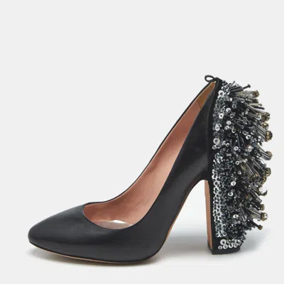 Pre-owned Black Leather Crystal Embellished Block Heel Pumps Size 39