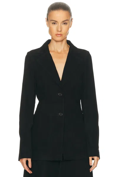 Rohe Suede Cinched Blazer in Black Self: 100% goat suede Lining: 100% viscose. Made in India. Specialized dry clean. Button closure. 2 pocket styling. ROHF-WO10. 417-11-138. About the designer: