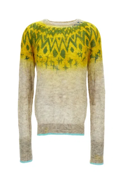 This exquisite wool blend knitwear from Rohka features a crew neck and ribbed trim for a refined yet comfortable fit. The unique garment-dyed technique presents a stunning gradient from vibrant yellow to neutral beige. The upper section showcases a striking green geometric and star pattern, adding a distinctive flair to your casual wardrobe. - Material - Wool blend - Fit - Regular fit - Care Instructions - Dry clean only