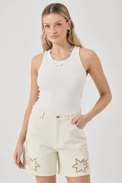 Mid rise relaxed short Finished hem at mid thigh Button fly Made with a non stretch denim for an authentic vintage look Will soften and shape to the body with wear In Bloom is a seasonal cream colour with custom floral lace embroidery cutout details along the seam