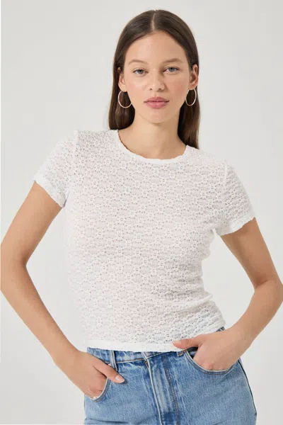 Slim-fitting crew neck tee for a sleek, feminine silhouette Crafted from a unique floral daisy lace jersey for standout texture Semi-sheer finish adds a delicate, romantic touch Perfect for layering or wearing solo as a standout piece