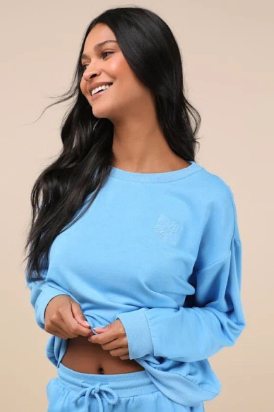 The Roxy Surfing By Moonlight Blue Pullover Sweater makes beach day plans easier (and comfier) than ever! Soft and stretchy knit fabric shapes this easy-wearing sweater with a crew neck bodice that boasts an embroidered hibiscus flower-inspired detail at the side. Long sleeves with drop shoulders and fitted cuffs frame the relaxed pullover bodice, which finishes with a banded hem. Ribbed accents at the hem and cuffs. Pair with the matching shorts for a complete look! Length: Size medium measures 23.5" from shoulder to hem. Fabric: Fabric is very stretchy. Unlined. 68% Modal, 29% Polyester, 3% Elastane. Wash Separately. Wash & Iron Inside Out. Machine Wash Cold Gentle Cycle. Do Not Bleach. Do Not Tumble Dry. Cool Iron. Do Not Dry Clean. Imported. Lulus | Surfing By Moonlight Blue Pullover Sweater | Size Large.