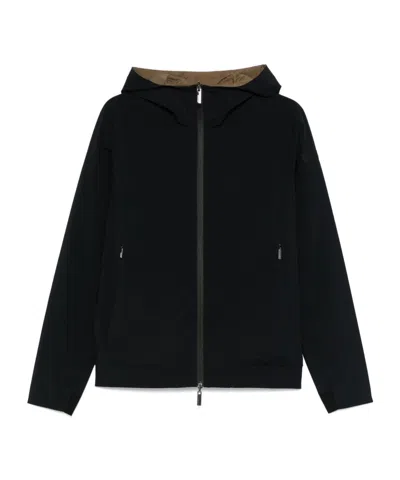 Versatility and essential design are emphasized by the waterproof and breathable membrane fabric exterior. The double-slider zip on the front is flanked by large and practical side pockets, closed by invisible zips. Fluorescent orange rear puller and black micro-injection logo on the left sleeve.