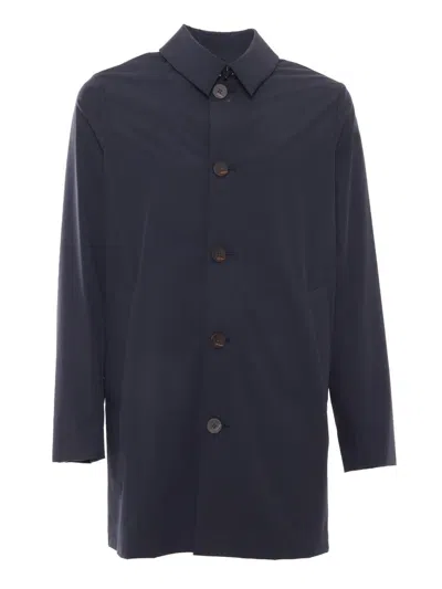 Long blue jacket RRD men's long blue jacket in polyurethane, classic collar, central front buttoning.