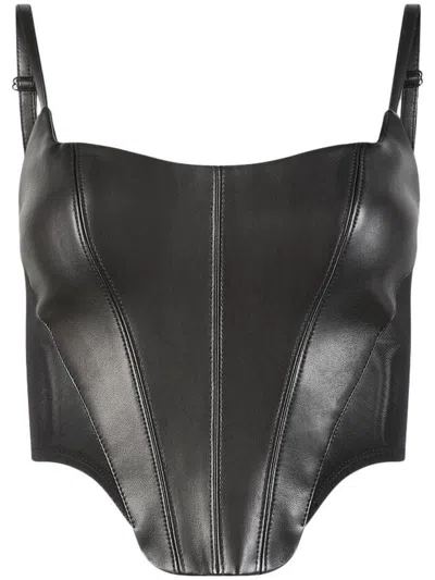 RtA Dinis Corset Top in Black - Black. Size 0 (also in 2, 4, 6). Self: 100% lambskin leather Contrast Fabric: 82% nylon 18% spandex Lining: 96% polyester 4% spandex. Made in China. Professional leather clean only. Exposed back zip closure. Boned bodice. Adjustable shoulder straps. Mesh panels. Item not sold as a set. RTAF-WS285. WS23L434-T1345BLACK. About the designer: RtA is the brainchild of Eli Azran and David Rimokh, a Los Angeles-based design duo. RTA denim is a movement, not only a product, but a culture that embraces the creative aspiration of the individual and combines street lifestyle with obscure nature in the constant search to attain awe. The collection is a collaboration of feminine and androgynous, combining street lifestyle with obscure nature. Road to Awe is a constant journey to bettering yourself, says Azran.