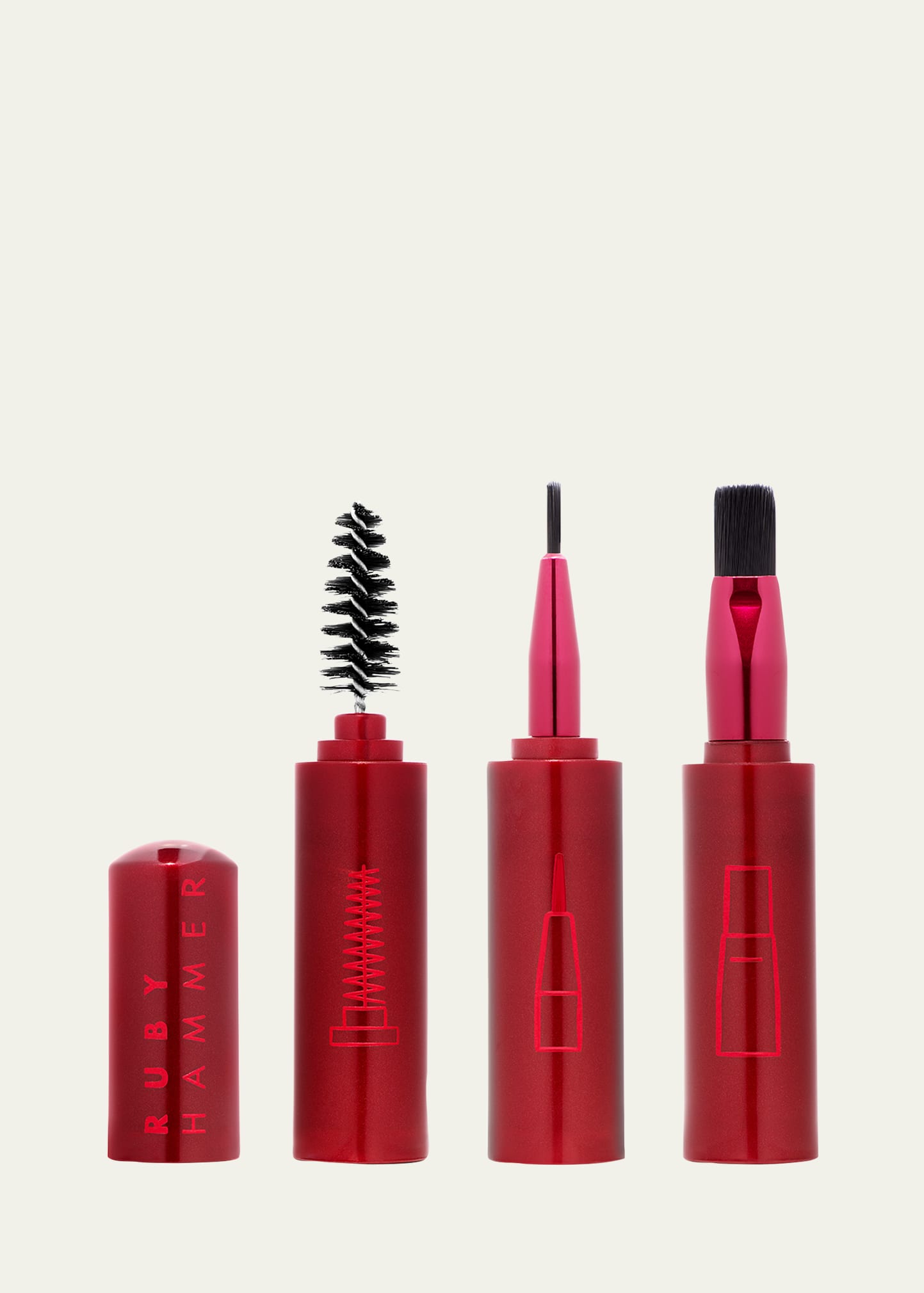 Define, line and groom with three interchangeable magnetic brush heads All brushes work with cream, powder, liquid, and gel formulas Sustainably designed, responsibly made, vegan and cruelty-free ABS/resin handle, Aluminium ferrule, Synthetic brush fibers Imported