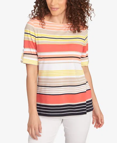 RUBY RD. Petite Multi Stripe Roll Tab Sleeve T Shirt In Red