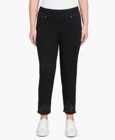 RUBY RD. Petite Pull On Embroidered Hem Black Ankle Jeans