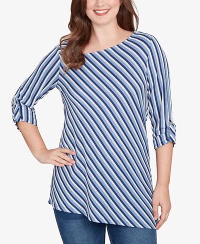 RUBY RD. Petite Textured Stripe Roll Tab Sleeve Top In Blue