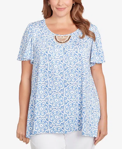 RUBY RD. Plus Size Beaded Macrame Puff Print Top In Blue