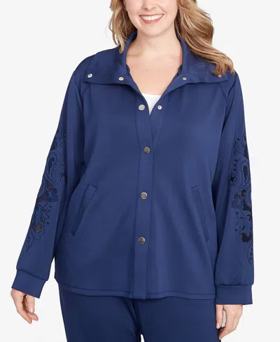 RUBY RD. Plus Size Embroidered Floral Cutout Snap Jacket In Blue