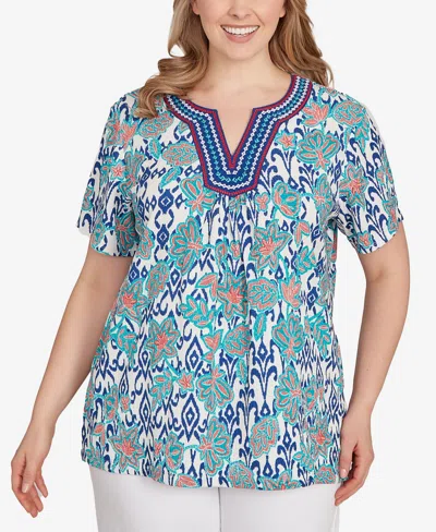 RUBY RD. Plus Size Floral Overlay Ikat Embroidered Top In Multi