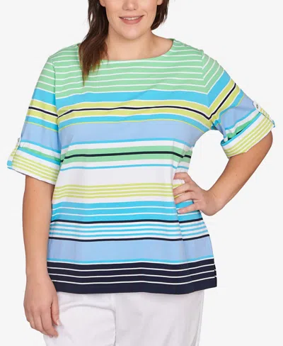 RUBY RD. Plus Size Multi Stripe Roll Tab Top In Green