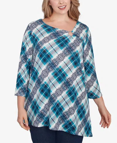 RUBY RD. Plus Size Ring Neck Plaid Hatchi Knit Top In Navy Multi