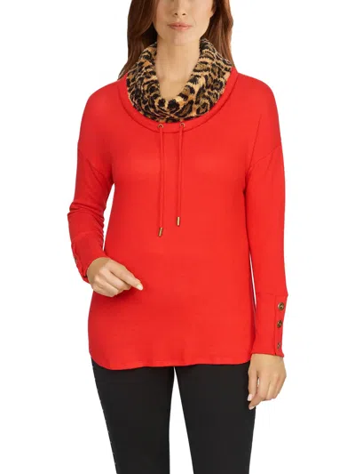 RUBY RD. Womens Faux Fur Trim Cowl Neck Pullover Top In Multi
