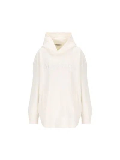 Max Mara "VISIERA" oversized hoodie in white cotton technical jersey. Minimalist design with welt pockets and tone-on-tone embroidered logo. Perfect for casual-chic looks and seasonal layering. - Material: 78% cotton, 22% polyester - Color: white - Long sleeves with a low turn - Welt pockets on the front - Tone-on-tone embroidered Max Mara logo on the chest - Ribbed cuffs - Straight hem - Item code: 2529946011600001
