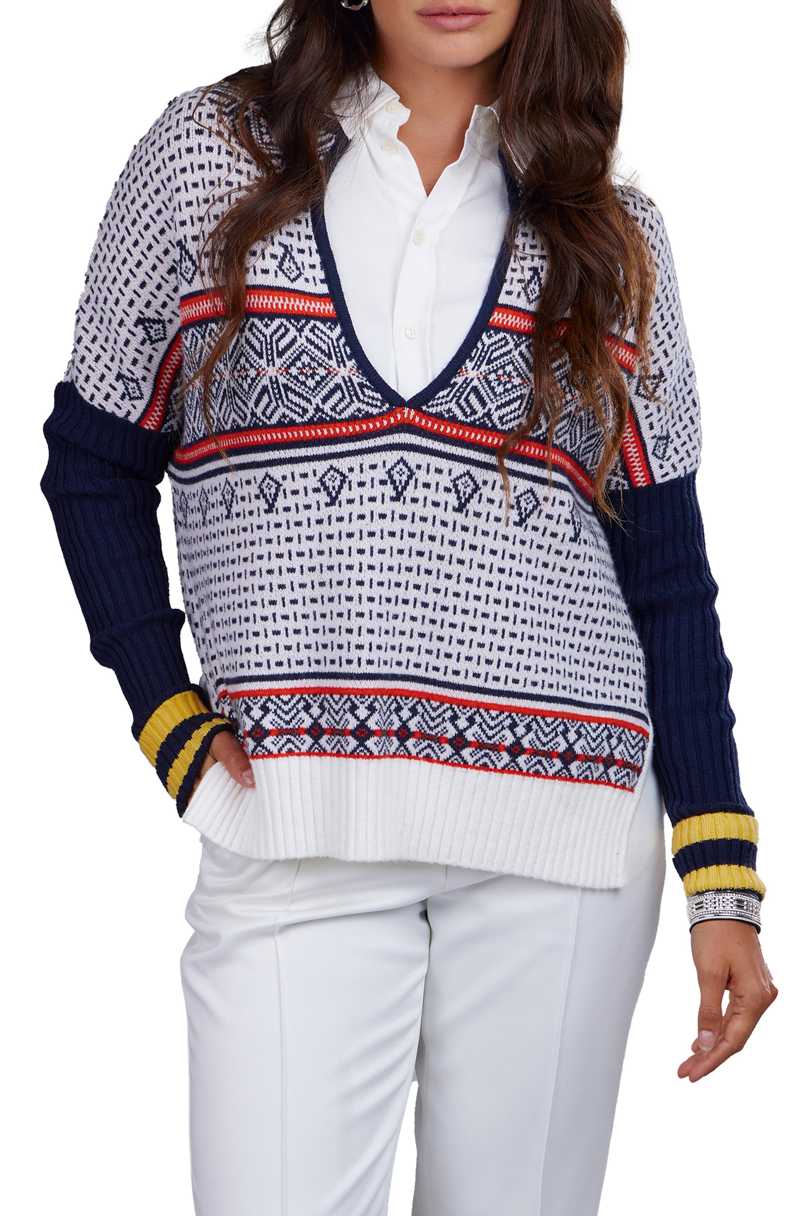 A Fair Isle design adds a festive spirit to this cozy knit pullover framed with a deep V-neckline that'll look great layered. V-neck Long sleeves 100% acrylic Hand wash, line dry Imported