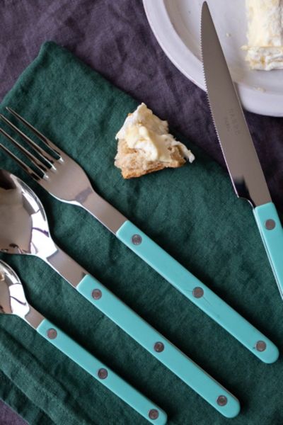 With the Bistrot collection, we were inspired by some of our favorite places: restaurants, terraces and cafés. When designing this cutlery, we wanted to faithfully capture the atmosphere while adding a modern touch: the styling is simple, the rivets are visible, while the colors and materials stand out nicely. From red to blue, not forgetting the superb materials with horn or tortoise effects. Content + Care The Sabre 4-piece sets are comprised of a soup spoon, a dinner fork, a dinner knife and a teaspoon. This 4-piece set offers the perfect combination for your day-to-day meals. Stainless steel 18/10 with an acrylic handle Shiny finish The Bistrot collection is dishwasher safe at 45° C (113° F) maximum. When washing by hand, we recommend that you do not use abrasive sponges. -If small rings appear on the knife blades, they can be easily removed with a soft cloth and/or white vinegar. For cutlery with light-coloured handles, avoid prolonged contact with foods that stain (coffee, tea, tomato sauce, etc.). Sabre 4 Piece Bistro Flatware Set in Green at Urban Outfitters