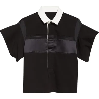 This mixed-media pullover is designed with a rugby-inspired contrast collar and placket, while shimmery satin and sheer mesh form tonal chest stripes. The boxy sleeves are open at the sides but narrow at the cuffs for a sculpted look. Hidden-button half placket Spread collar Elbow-length sleeves 100% cotton with 100% polyester contrast Dry clean Made in Japan Designer Clothing Asian & Pacific Islander Owned/Founded