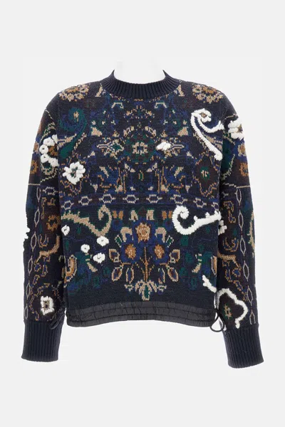 SACAI sweater with a floral jacquard and a drawstring cinched hem Crew neckline Long sleeves Relaxed fit Hip length Pullover style Wool/polyester/wool Dry clean Imported