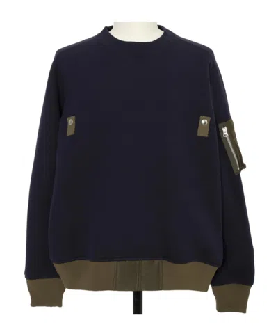 SACAI's Sponge Sweat Pullover in Navy/Dark Khaki is a versatile and stylish addition to any wardrobe. This pullover combines comfort with a modern aesthetic, making it perfect for both casual and semi-formal occasions. Composition: Cotton 62%, Pe 38%, Attached Parts:Cotton 100%, Nylon 100%, Pe 55%, Cotton 44%, Polyurethane 1%, Filling:Pe 100% Features a unique color block design in navy and dark khaki. Relaxed fit for ultimate comfort and ease of movement. Ribbed cuffs and hem for a snug and secure fit. Perfect for layering or wearing on its own. Model is 187 cm and wears size 2 SKU: 2503789M 233 | Sacai Men's Sponge Sweat Pullover, Navy/Dark Khaki, 100% Cotton, Size: 3