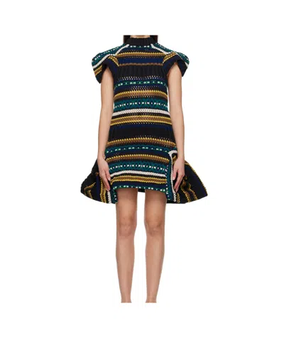 Knitted dress with jacquard stripe detail, ribbed crew neck and cuffs, irregular hem, raglan cap sleeves.