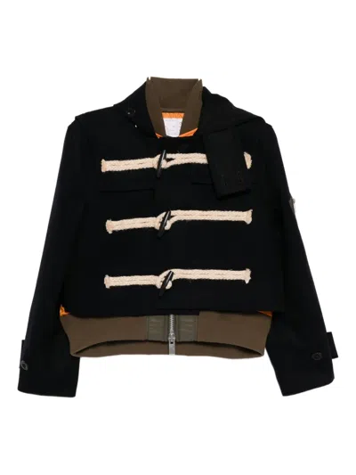 Sacai 'Melton' blue navy wool jacket with layered design, hood, studs detail, montgomery and zip closure, zip pocket on the sleeve, contrast details, button cuffs, straight hem.