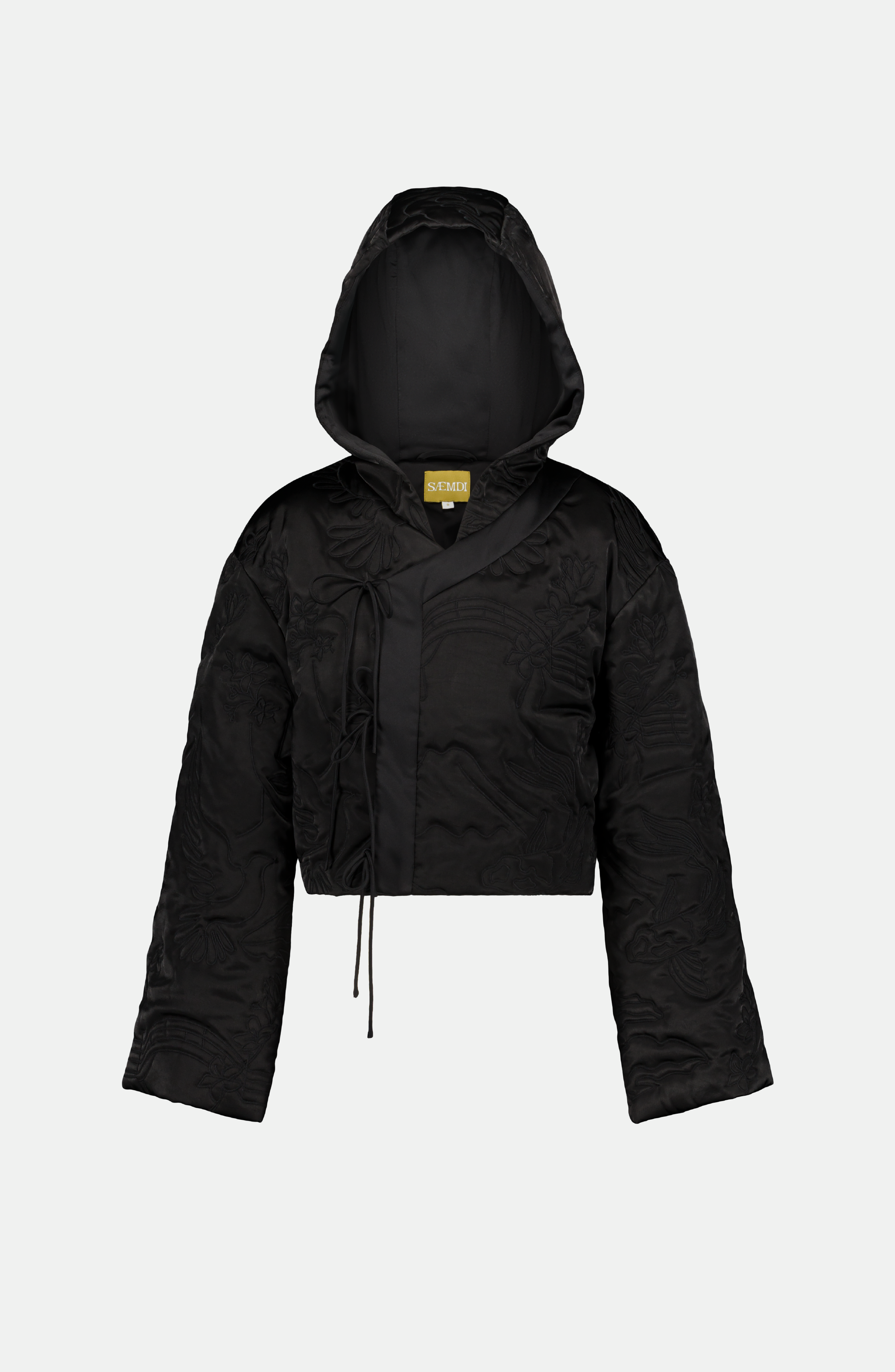 Padded satin-like jacket with all-over Japanese-inspired embroidery. Oversized hood and wrap closure. 100% polyester True to size Model is wearing S and is 170 cm