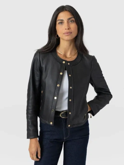 Buy The Skye Jacket. A slim-fitting, button-up leather jacket with a collarless neckline and cropped length. From our Women's Jackets Collection here at Saint + Sofia. Look: Cropped long-sleeved leather jacket. Gold popper front fastening, zip pockets and zip detail at cuff. Fit: True to size. Material: 100% Lamb Leather Origin: Made in Europe. Care: Dry clean.